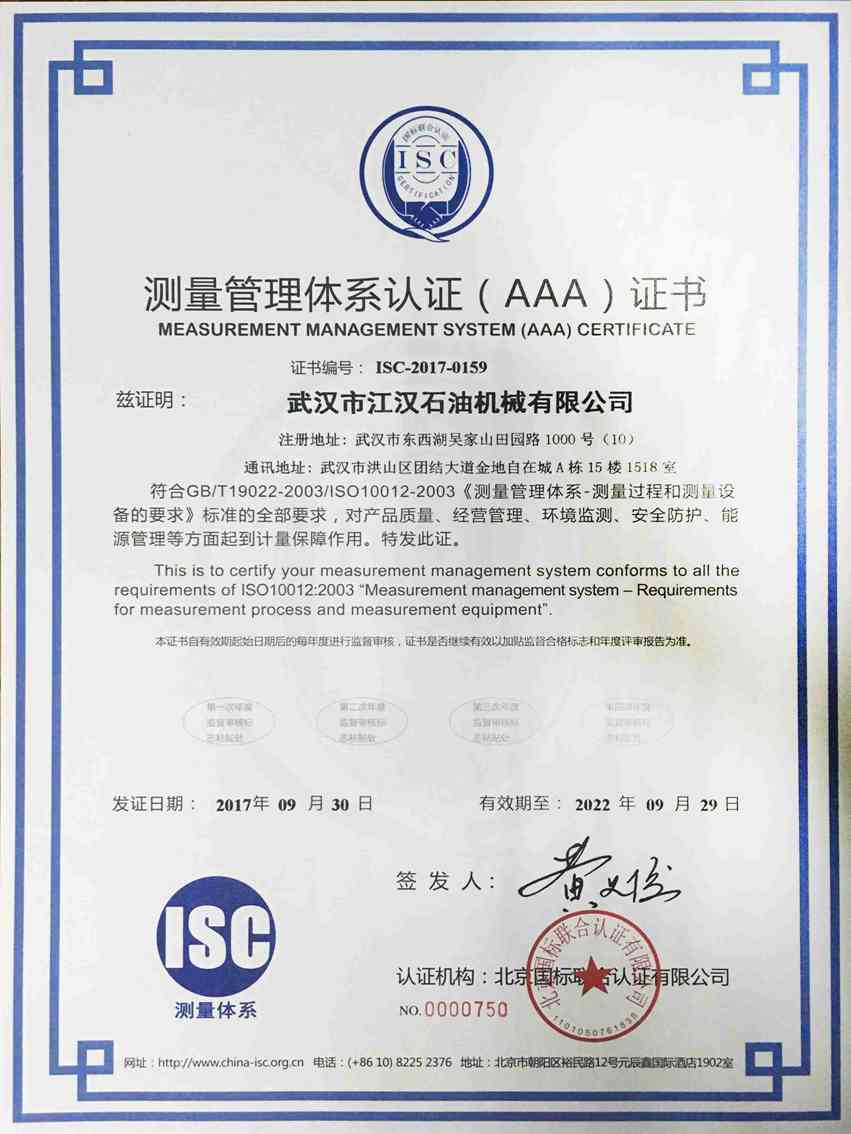 測(cè)量管理體系證書(shū)